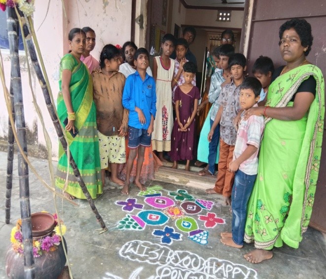 The Pongal celebrations for 2026 took place on the 14th - 17th January across Tamil Nadu, and the Rose Sisters celebrated with students at the Sunshine School. Pongal is the harvest festival celebrated every January, and the word "pongal" means "to boil over", which symbolises symbolizing abundance and prosperity. It also refers to the Pongal dish, which is made as part of the celebrations and is a sweet dish of rice cooked in boiling milk. The students also helped decorate the floor decorations you can see in this picture, called kolams, which are usually drawn with rice flour or colourings and traditionally were thought to bring prosperity to the homes they are outside.